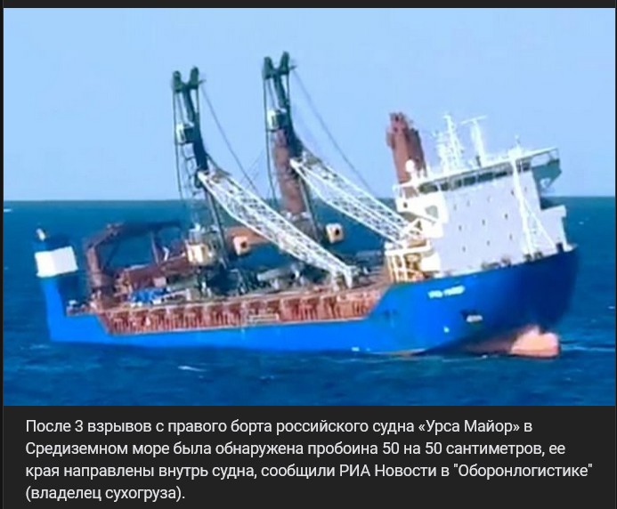 Zdroj https://vk.com/wall-123538639_4429869 z 26.12.2024 + diskusia aké útoky na loď tam popisujúPo 3 výbuchoch na pravoboku ruskej lode "Ursa Major" (Урса Майор) v Stredozemnom mori sa našla diera s rozmermi 50 x 50 centimetrov, ktorej okraje smerovali dovnútra plavidla, uviedla pre agentúru RIA Novosti spoločnosť Oboronlogistik (Оборонлогистик), vlastník nákladnej lode.
