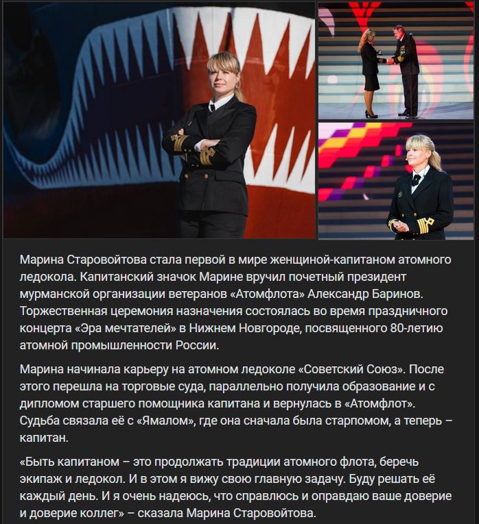 Marina Starovojtova (Марина Старовойтова) sa stala 1. ženou na svete, ktorá sa stala kapitánkou atómového ľadoborca. Kapitánsky odznak Marine odovzdal čestný prezident murmanskej organizácie veteránov „Atomflot“ (Атомфлот) Aleksandr Barinov (Александр Баринов). Slávnostná ceremónia vymenovania sa konala počas slávnostného koncertu „Éra snílkov“ v Nižnom Novgorode, venovaného 80. výročiu atómového priemyslu Ruska.
