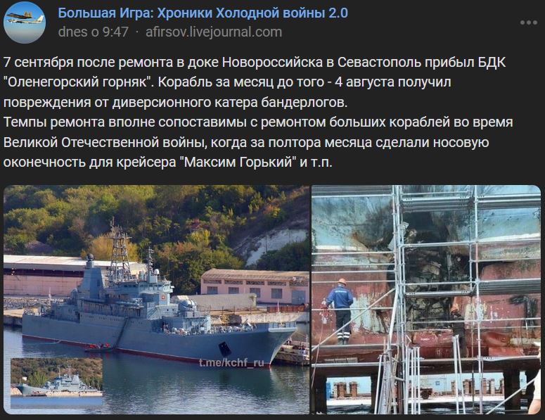 Štvrtok 07.09.2023 po opravách v doku Novorossijsk dorazil BDK "Olenegorskij gornjak" (Оленегорский горняк) do Sevastopoľa. Loď bola mesiac predtým - piatok 04.08.2023 - poškodená sabotážnym člnom banderovcov. Tempo opravy je celkom porovnateľné s opravou veľkých lodí počas Veľkej vlasteneckej vojny, keď za 1,5 mesiaca urobili novú prednú časť pre krížnik "Maxim Gorkij" (Максим Горький) a podobne.