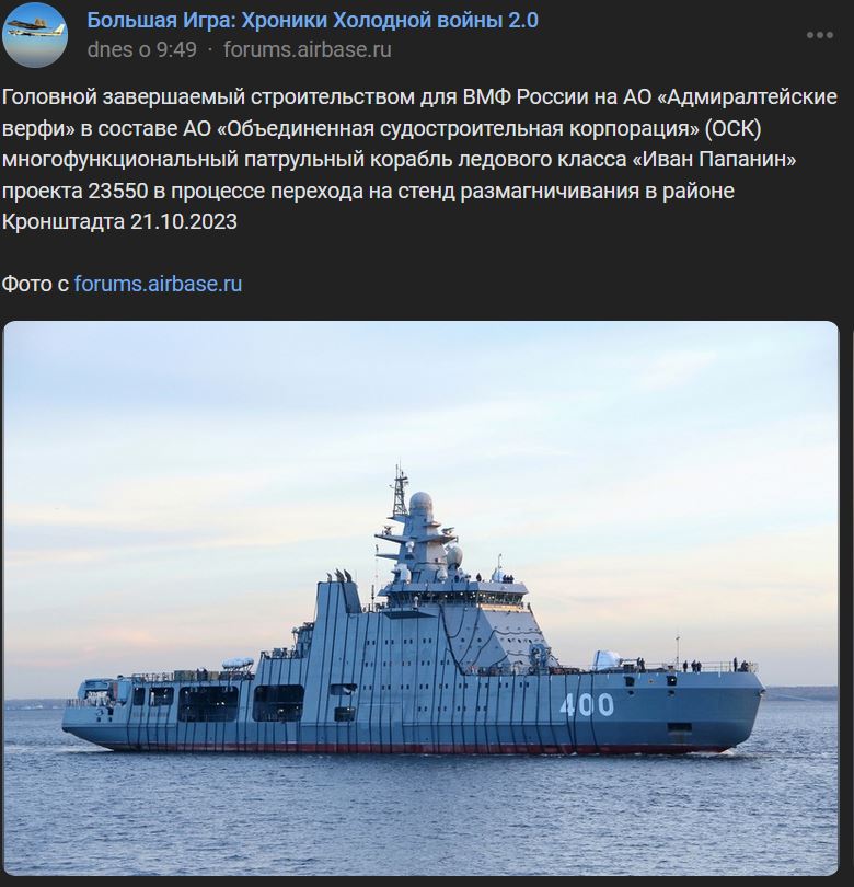 Hlavná multifunkčná hliadková loď ľadovej triedy Ivan Papanin (Иван Папанин) projektu 23550, ktorá je finalizovaná pre VMF Ruska v AO Адмиралтейские верфи ako súčasť AO OSK, je v procese prechodu na demagnetizačný stend v oblasti prístavu Kronštadt (Кронштадт)