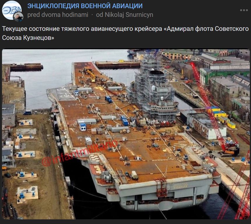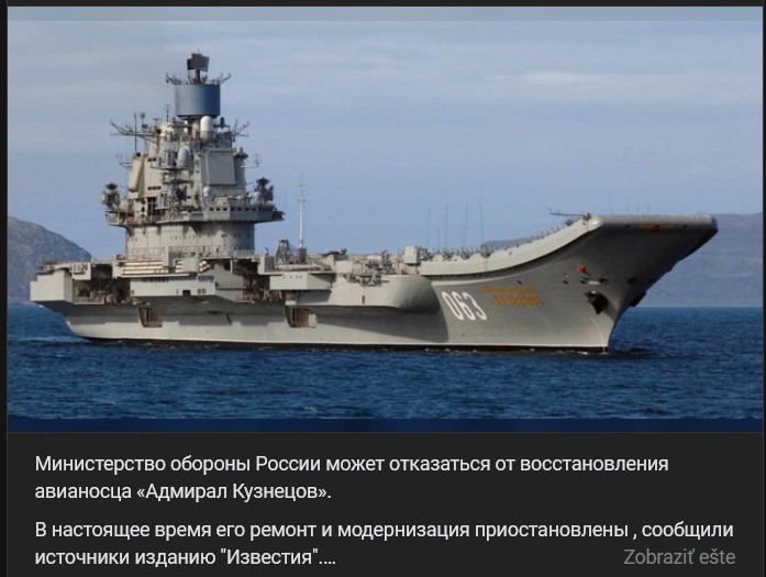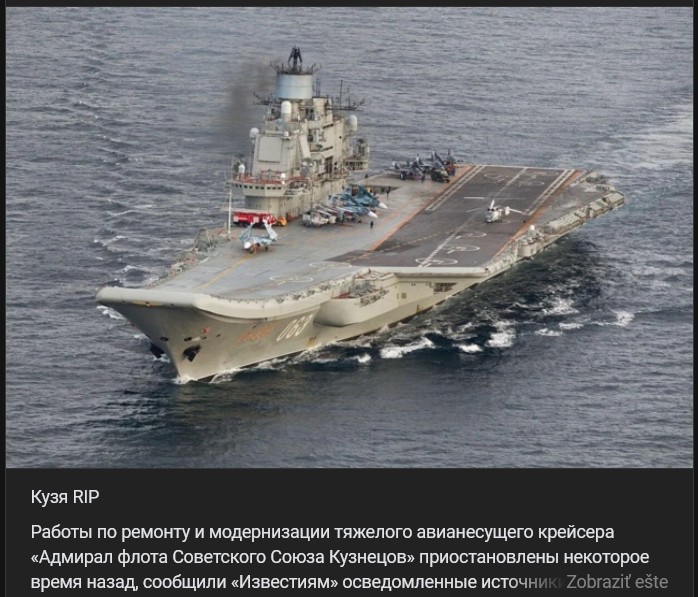 Práce na oprave a modernizácii ťažkého lietadlového krížnika "Admiral flota Sovietskeho Zväzu Kuznecov" (Адмирал флота Советского Союза Кузнецов) sú už nejaký čas pozastavené, uviedli pre Izvestija "informované zdroje". V blízkej budúcnosti zástupcovia Hlavného velenia námorníctva a Zjednotenej lodiarskej korporácie (OSK) prijmú rozhodnutie o tom, či je účelné pokračovať v týchto prácach na Admiralovi Kuznecovovi a vrátiť ho do flotily, uviedli zdroje. „Admiral Kuznecov“ je v oprave od roku 2017.