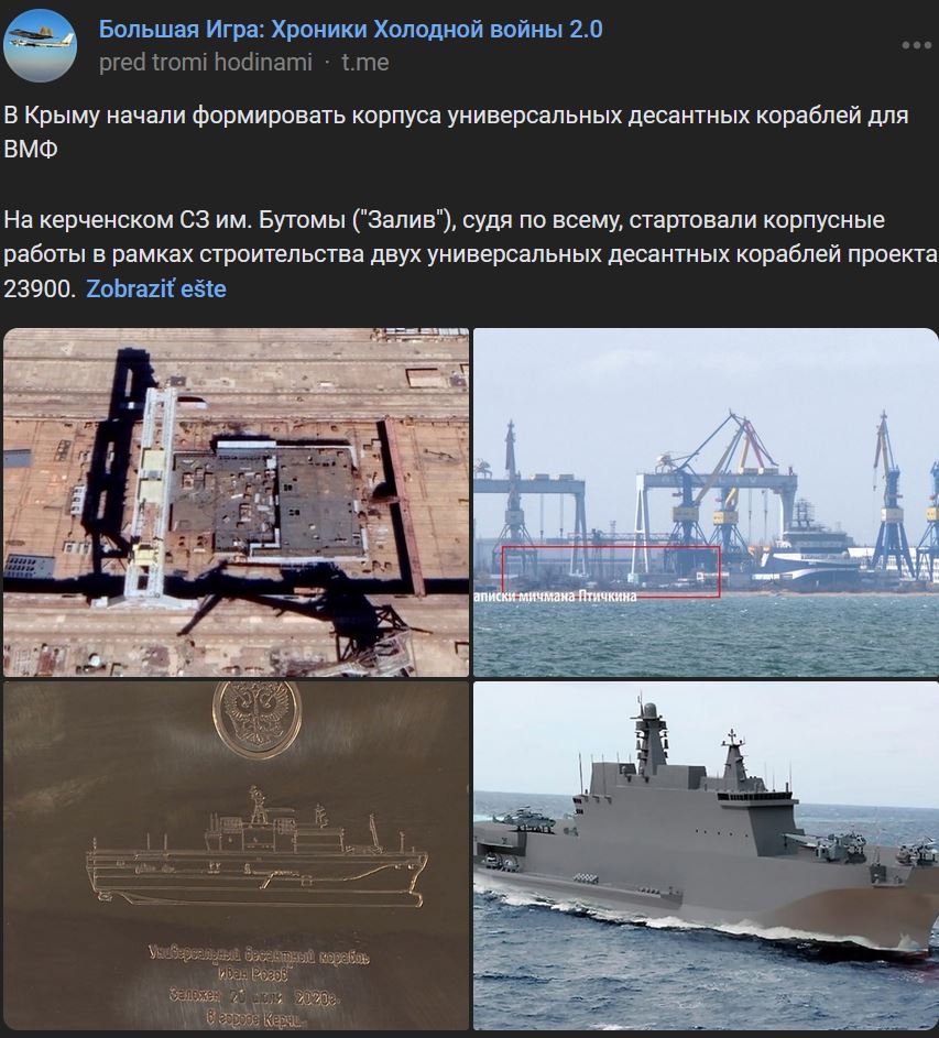Na Kryme sa začali formovať trupy / korpusy univerzálnych výsadkových lodí pre VMF Ruska. V lodeniciach Butoma v Kerči (Zaliv/Залив) sa zrejme začali práce na trupoch 2 univerzálnych výsadkových lodí projektu 23900. Zmluva / kontrakt na výstavbu UVL (УДК) bola zadaná v roku 2020. Zároveň boli 20.07.2020 založené obidve lode. Boli pomenované Ivan Rogov (Иван Рогов) a Mitrofan Moskalenko (Митрофан Москаленко).