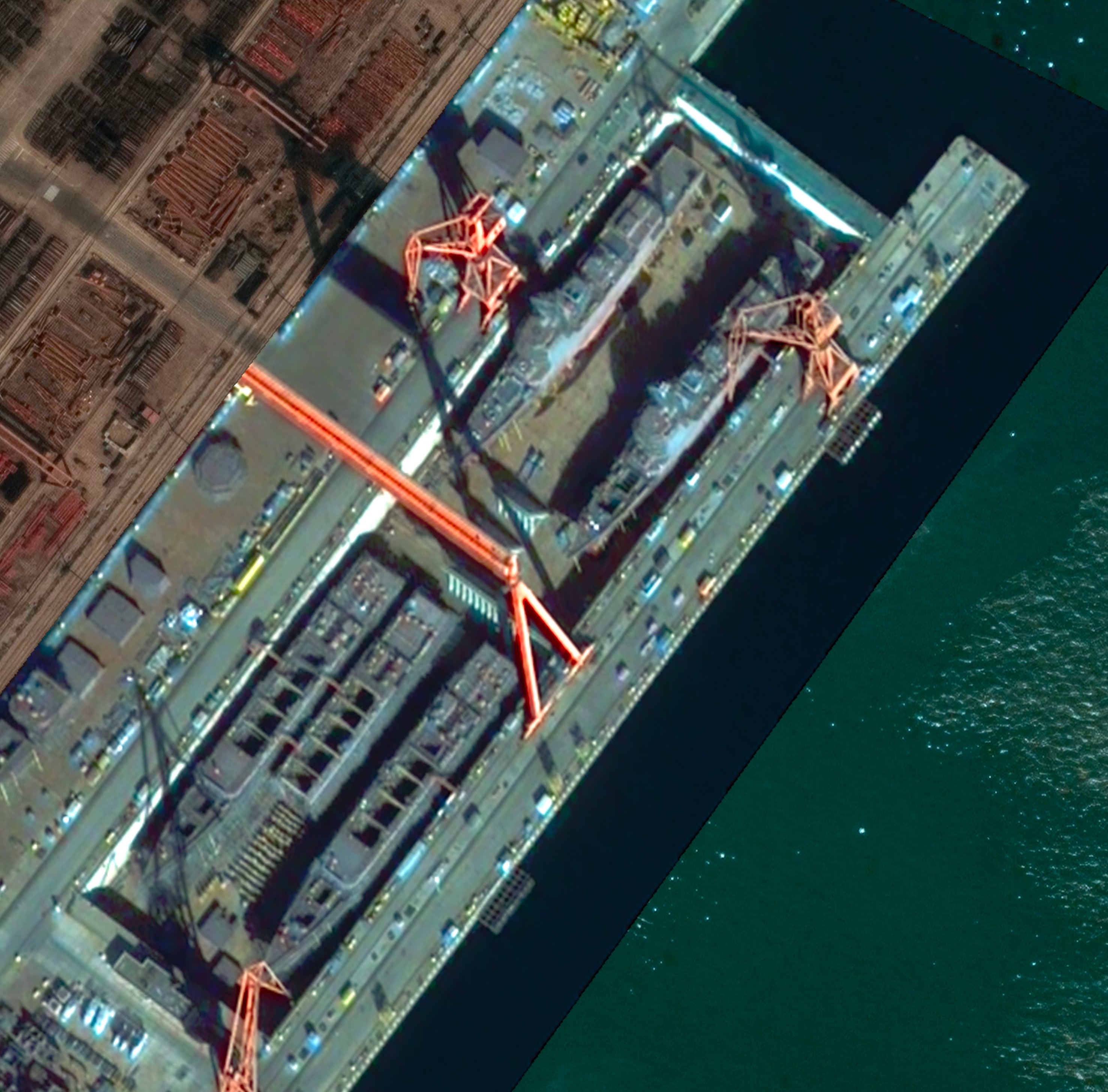 Na severu Číny se loni po krátké přestávce opět rozběhla stavba nové série torpédoborců Type 052D. Čerstvé satelitní snímky ukazují, že se současně staví 5 jednotek, z čehož 2 budou na vodu spuštěny v nejbližší době.