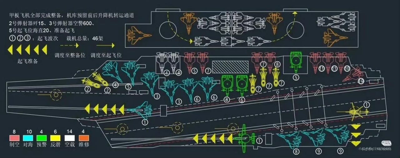 Plán rozloženia palubnej leteckej techniky na čínskych lietadlových lodiach projektu „Fujian“.