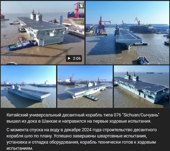 Loděnice Hudong-Zhonghua v Šanghaji 27. prosince spustily na vodu osmou čínskou nosnou válečnou loď a první loď třídy Type 076 Sichuan, která může být s výtlakem přes 40 000 tun nejtěžší obojživelnou útočnou lodí na světě.