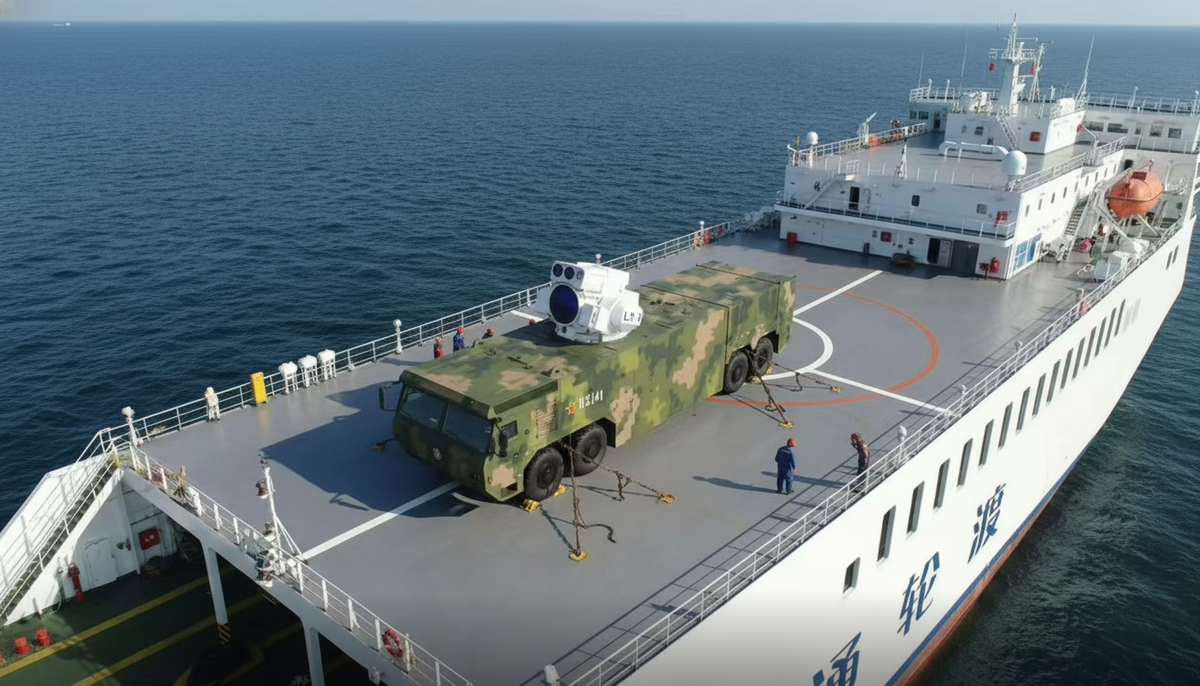 Laserový systém LY-1 namontovaný na otevřené palubě civilní lodi