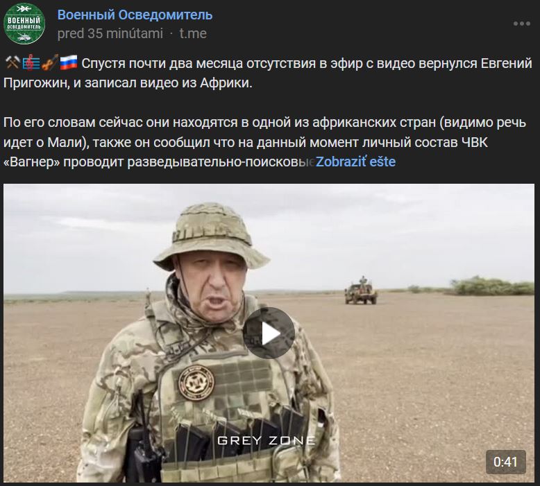 Po takmer 2 mesiacoch neprítomnosti vo vysielaní videí sa Jevgenij Prigožin (Евгений Пригожин) vrátil do vysielania s videom z Afriky. Podľa neho sa teraz nachádzajú v jednej z afrických krajín (zrejme ide o Mali), povedal tiež, že v súčasnosti personál ČVK "Vagner" vykonáva prieskumné a pátracie činnosti s cieľom nájsť militantov.