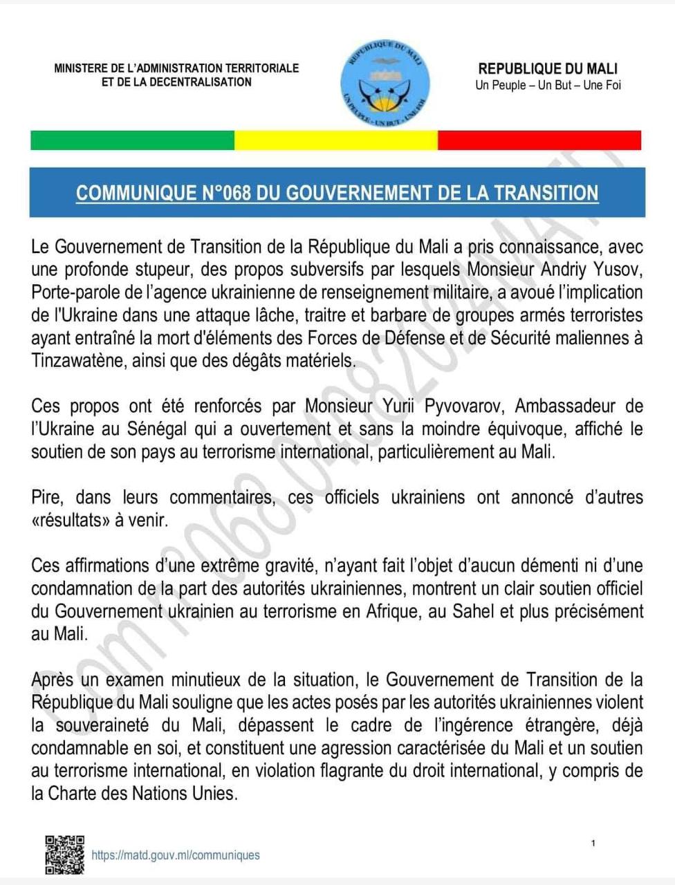 Přechodná vláda Mali oznámila, že přerušuje diplomatické vztahy s Ukrajinou kvůli její podpoře teroristů v Africe. Malijské úřady uvedly, že Ukrajina svým jednáním porušuje suverenitu Mali a podporuje mezinárodní terorismus v Africe a Sahelu.