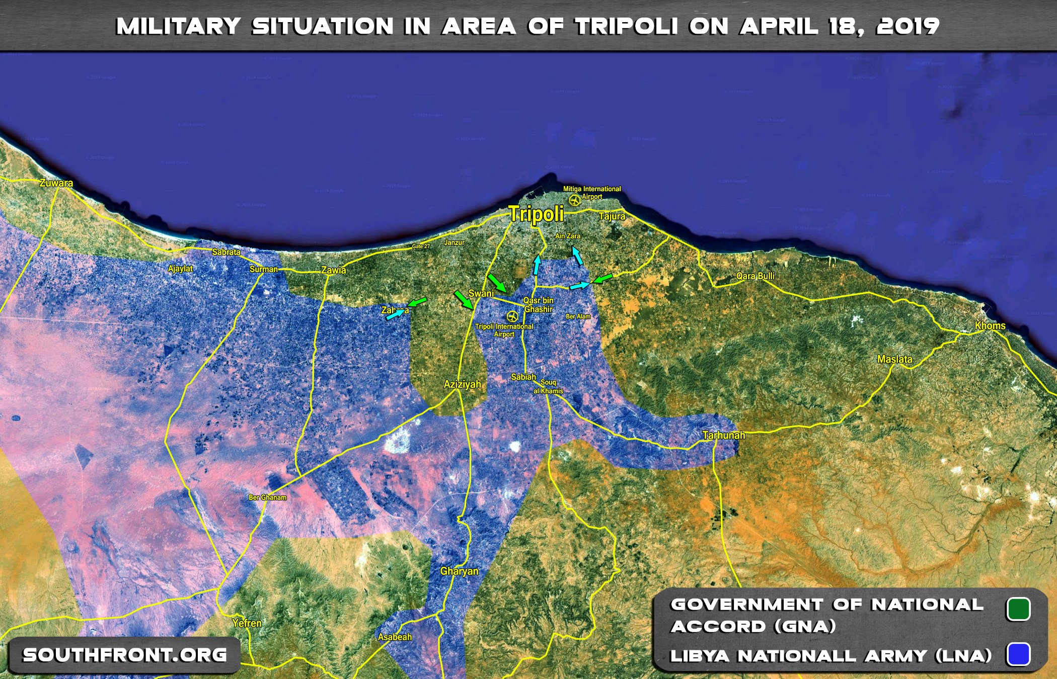 18. dubna, síly loajální vládě národní dohody (GNA) deklaroval, že oni zachytili Tamanhint leteckou základnu v centrální Libyi od Libyan národní armády (LNA). Podle zdrojů pro-GNA bylo v nájezdu zachyceno několik vozidel LNA a další technika. Později pro-GNA jednotky byly nucené ustoupit z oblasti a LNA obnovila kontrolu nad letištěm. Přes tento, útok na toto letiště je pozoruhodné znamení a odhalil strategickou slabost sil LNA postupovat na Tripolis. Zatímco LNA ovládá velkou část země, mnoho oblastí bylo „získáno“ tím, že vytvořilo místní obchody a spojenectví s místními komunitami. Mnoho z těchto komunit však není připraveno bojovat o LNA. Bezpečnostní situace v mnoha z těchto oblastí tak zůstává komplikovaná a připravené jednotky pro-GNA jsou snadno schopny tam fungovat, pokud jsou připraveny riskovat. Ve stejné době, jednotky LNA pokračovaly ve svém postupu v blízkosti hlavního města GNA Tripolisu. Během posledních několika dnů dosáhli v tomto úsilí malého úspěchu. Nicméně, Tripolis mezinárodní letiště ještě zůstane v rukou LNA.