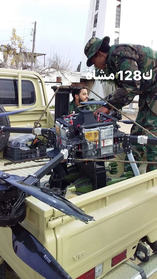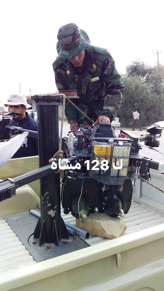 GNA Kvadrokoptéra nesoucí 2x120 mm minometné granáty :shock: , která byla stažena a zajata LNA . Tato metoda byla poprvé použita u ISIS, ale od té doby byla upravena několika nestátními aktéry. Vypadá to jako komerční platforma a dost pokročilá.