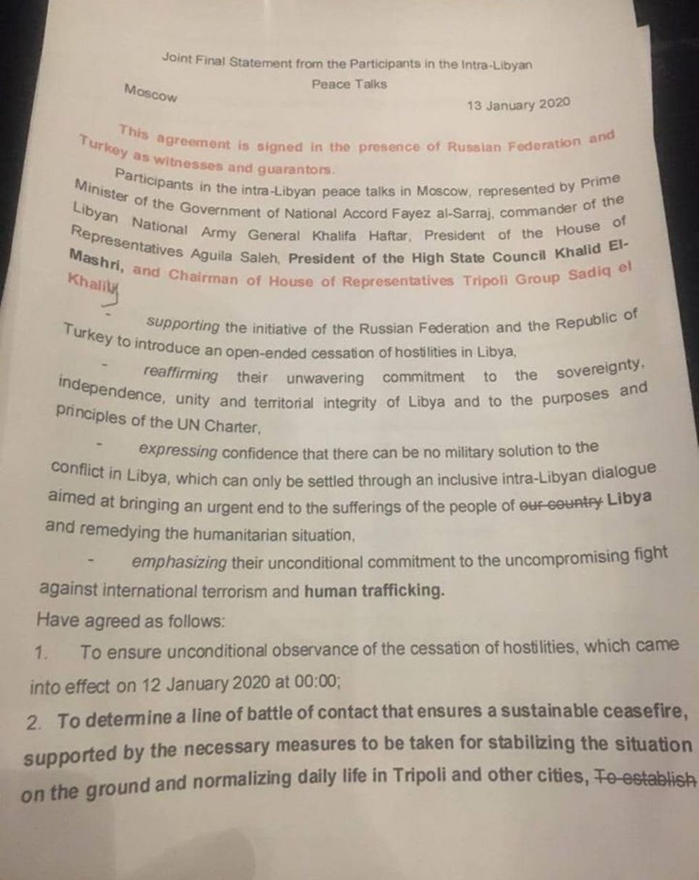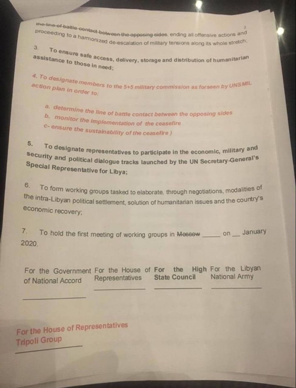 "Funkce kontroly příměří bude v rukou Ruska jako zahraniční strany,“ která bude vysílat inspekce do Libye za účelem sledování situace. Podle dokumentu se Organizace spojených národů rovněž zavazuje kontrolovat prosazování dohody. Námořní a pozemní přístavy zůstanou pod mezinárodním dohledem.