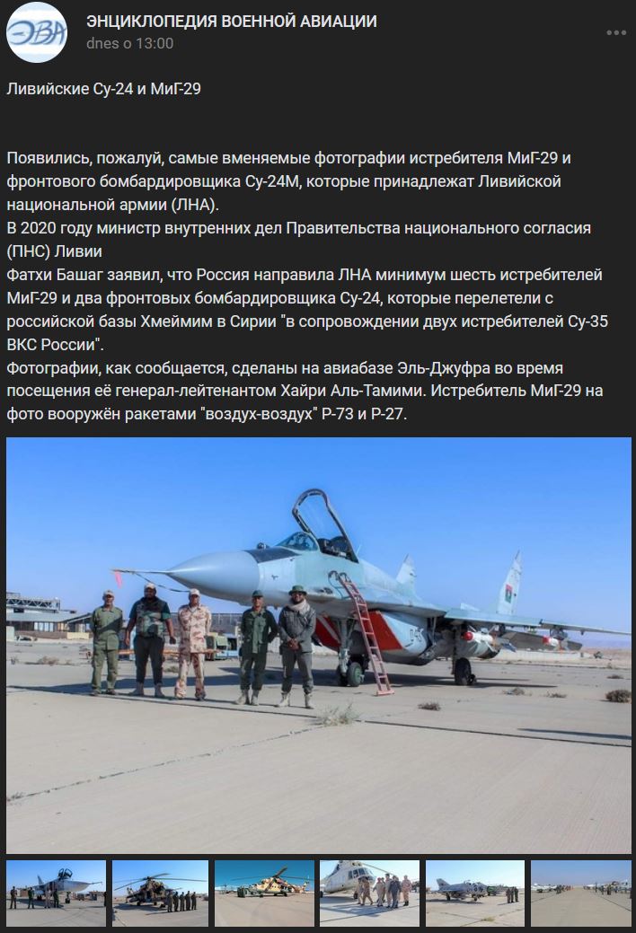 Na povrch vyplávali azda najrozumnejšie fotografie lietadla MiG-29 (МиГ-29) a frontového bombardéra Su-24M (Су-24М), ktoré patria Líbyjskej národnej armáde (LNA). V roku 2020 minister vnútra líbyjskej vlády národnej dohody (PNS) Fathi Bashag tvrdil, že Rusko poslalo LNA najmenej 6 lietadiel MiG-29 a 2 frontové bombardéry Su-24, ktoré odleteli z ruskej základne Hmeimimim v Sýrii "v sprievode 2 lietadiel Su-35 VSK Ruska". Fotografie boli údajne zhotovené na leteckej základni Al-Jufra počas návštevy generálporučíka Khairyho Al-Tamimiho. Lietadlo MiG-29 na fotografii je vyzbrojené raketami vzduch-vzduch rodiny R-73 a R-27.