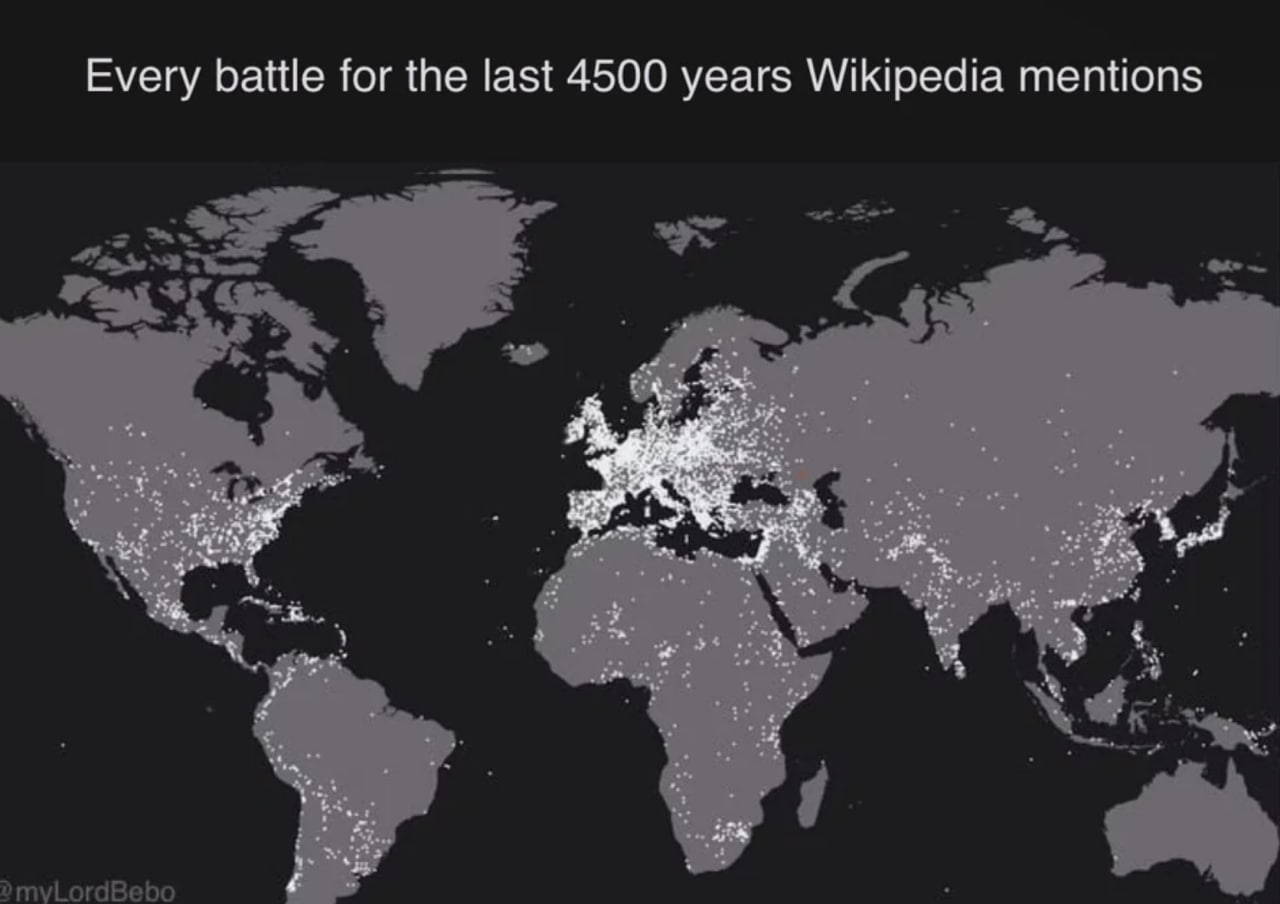 Mapa všech světových bitev za posledních 4500 let uvedených na Wikipedii