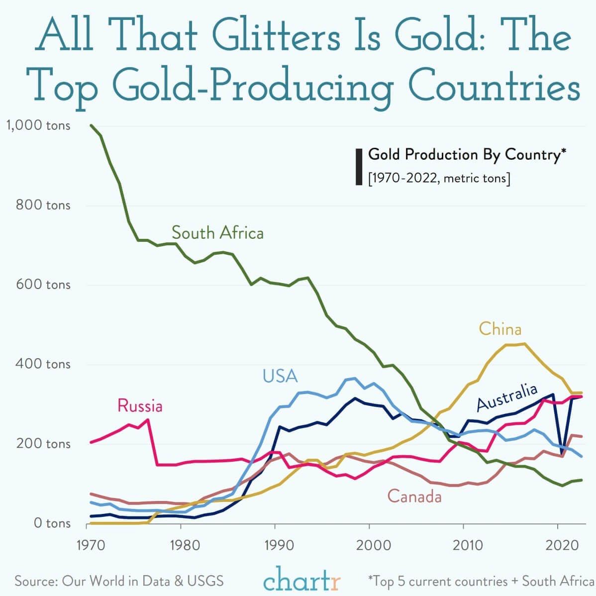 6 největších zemí produkujících zlato a objem produkce za rok od roku 1970