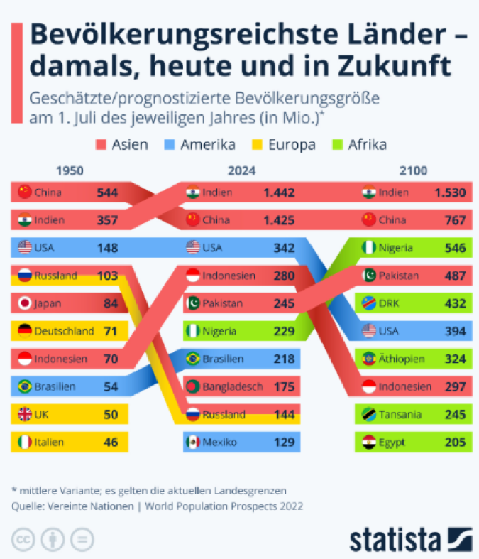 Současná první desítka začíná Mexikem a jeho přibližně 129 miliony obyvatel a končí 1 442 miliony Indů. Kromě Mexika se na seznamu nově objevují Pákistán, Nigérie a Bangladéš. V roce 2100 budou nejlidnatějšími zeměmi stále Indie a Čína, následované Nigérií, Pákistánem a Demokratickou republikou Kongo.