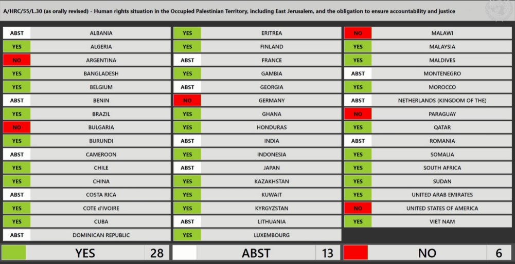 47 členských států Rady OSN pro lidská práva hlasovalo 28 pro, 6 proti a 13 se zdrželo hlasování, a přijalo rezoluci o situaci v oblasti lidských práv na okupovaném palestinském území, včetně východního Jeruzaléma, a o povinnosti zajistit odpovědnost a spravedlnost.