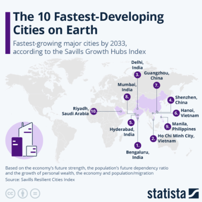 Nejrychleji se rozvíjející velká města do roku 2033 podle indexu Savills Growth Hubs. Zdroj: Statista.