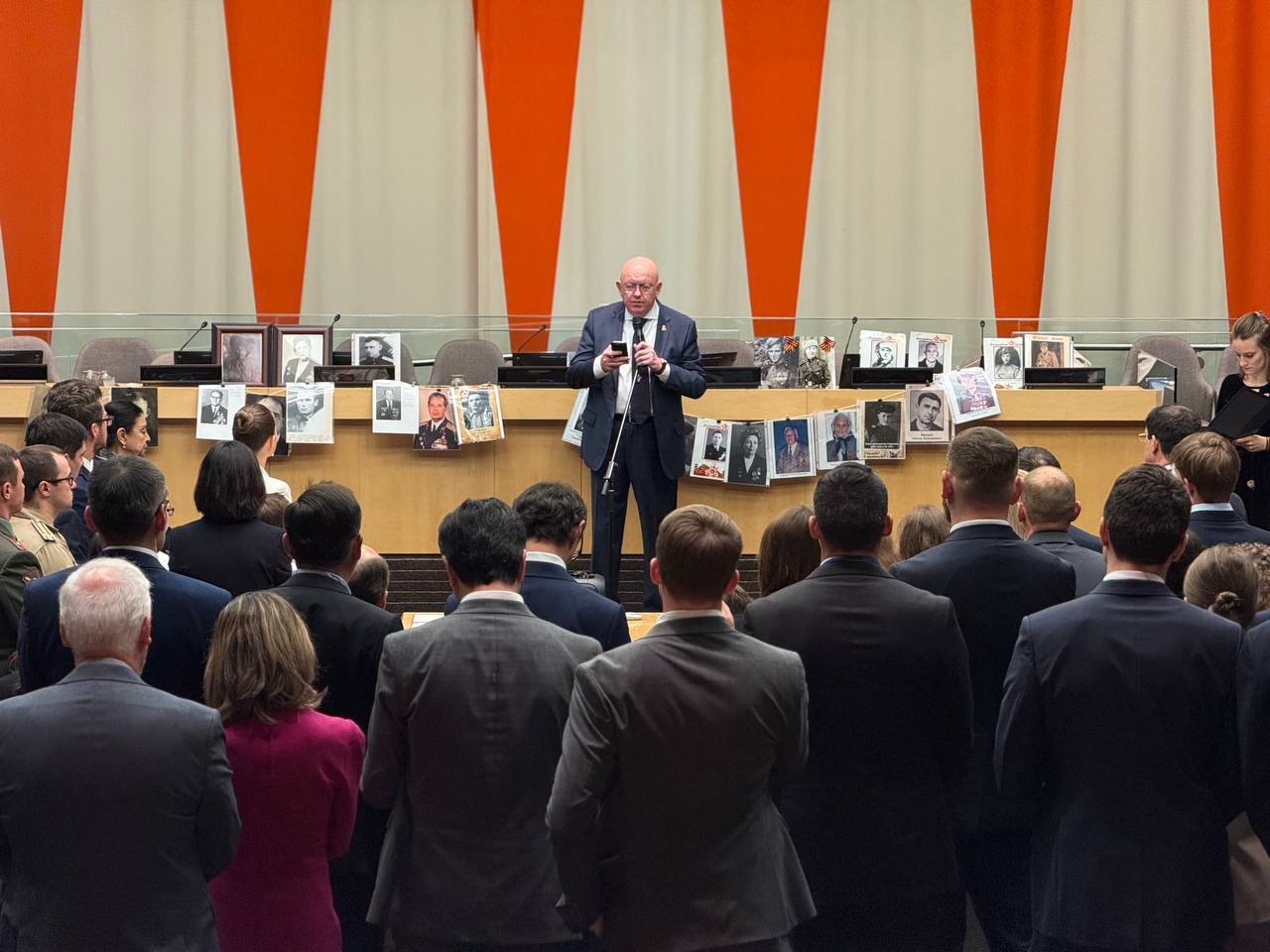 Před koncertem se ujal slova stálý zástupce Ruské federace při OSN Vasilij Nebenzja, který znovu zdůraznil, že „to byl Sovětský svaz, kdo rozhodujícím způsobem přispěl k vítězství nad nacismem“ a že údajně díky tomuto vítězství byla OSN vytvořena. Zmínil 27 milionů mrtvých sovětských občanů a ujistil, že Rusko nikdy nezlehčovalo roli svých spojenců. V samotném projevu však prakticky nepadla zmínka o dalších účastnících protihitlerovské koalice. Mezi PR snahami se objevila i výzva „Podpořme Rusko!“. V sále nebylo slyšet žádné rozhořčení.