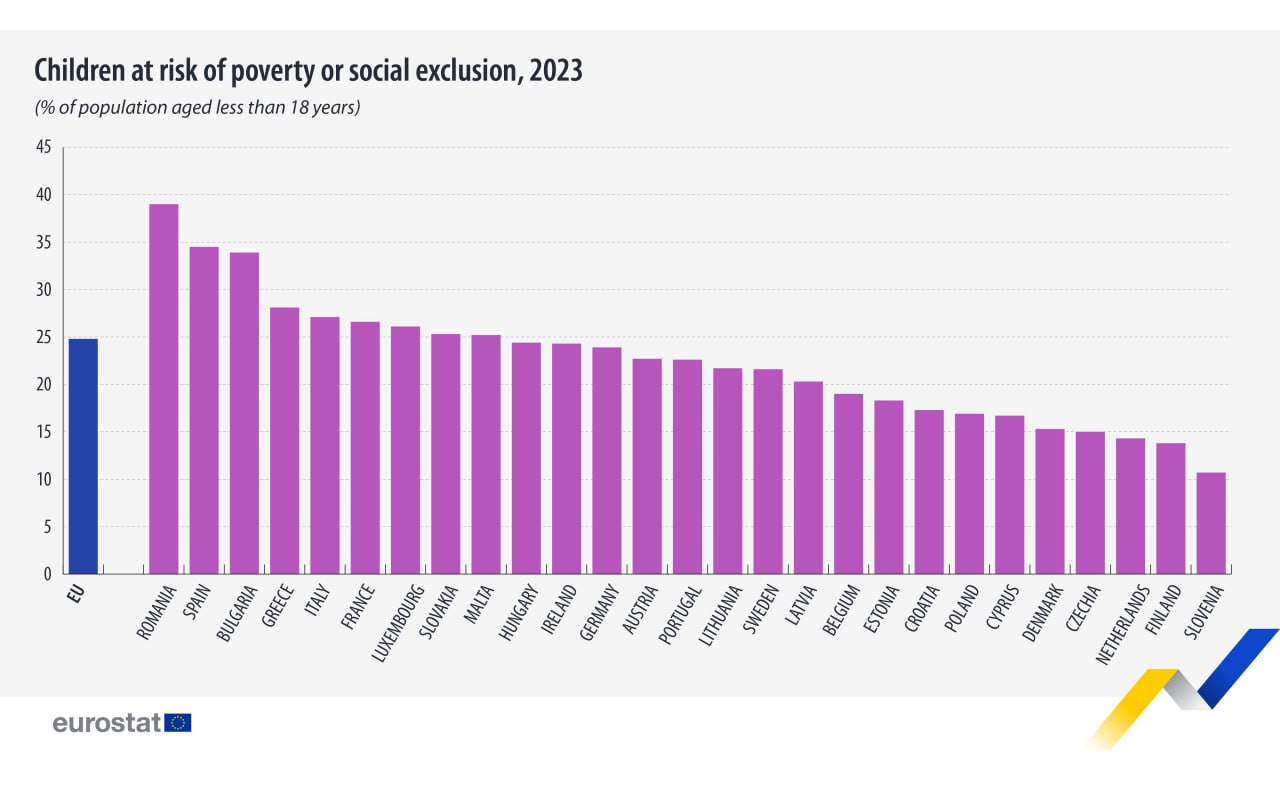 ▪️ 24,8 % dětí v EU bylo v roce 2023 ohroženo chudobou nebo sociálním vyloučením. Ve srovnání s předchozím rokem se tento údaj zhoršil o 0,1 %, uvádí (https://ec.europa.eu/eurostat/statistic ... y_findings) Eurostat.