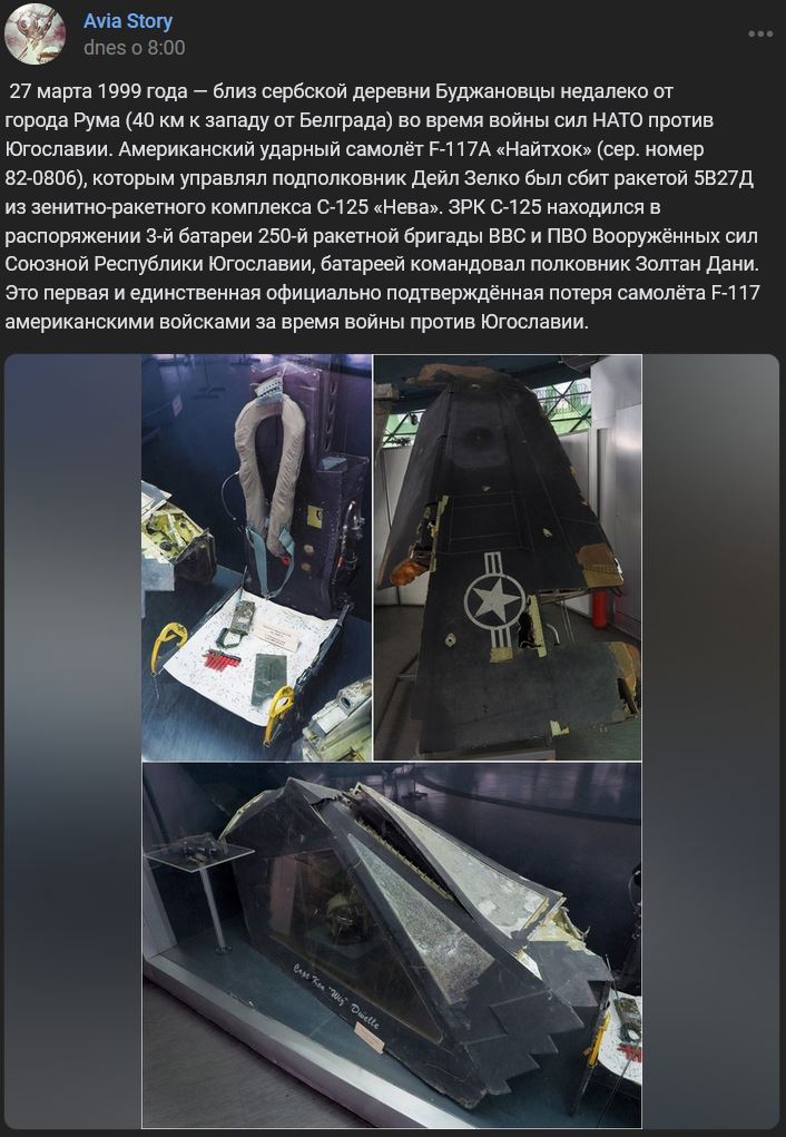 27.03.1999 = pred 25-timi rokmi pri srbskej dedine Bujanovci neďaleko mesta Ruma (40 km západne od Belehradu) počas vojenskej agresie NATO proti Juhoslávii. Americké bojové lietadlo F-117A Nighthawk (sériové číslo 82-0806), ktoré pilotoval podplukovník Dale Zelko, zostrelila raketa 5V27D (5В27Д) z raketového systému zem-vzduch S-125 Neva (С-125 Нева). PVO S-125 mala k dispozícii 3. batéria 250. raketovej brigády VVS a PVO Ozbrojených síl Zväzovej republiky Juhoslávie, batérii velil plukovník Zoltán Dani. Ide o prvú a jedinú oficiálne potvrdenú stratu lietadla F-117 americkými silami počas vojny proti Juhoslávii.