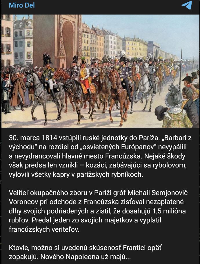 Zdroj https://t.me/Miro_Del/23787 z 30.03.202430.03.1814 vstúpili ruské jednotky do Paríža. „Barbari z východu“ na rozdiel od „osvietených Európanov“ nevypálili a nevydrancovali hlavné mesto Francúzska. Nejaké škody však predsa len vznikli – kozáci, zabávajúci sa rybolovom, vylovili všetky kapry v parížskych rybníkoch.