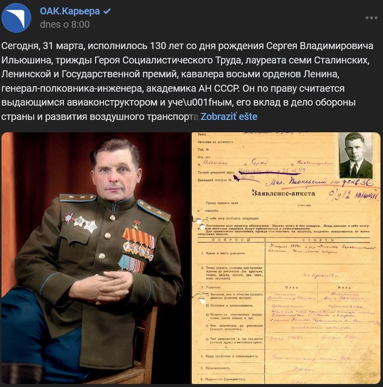 31.03.1894 = pred 130 rokmi sa narodil letecký konštruktér Sergej Vladimirovič Iľjušin (Сергей Владимирович Ильюшин)