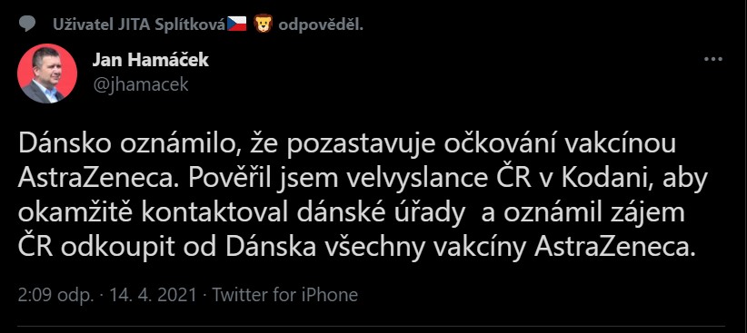 „Určitě na to budeme výhledově nějak reagovat,“ uvedl ministr. Připomněl, že podobně s ministry zahraničí zemí Evropské unie probíral podobné problémy i u vakcíny AstraZeneca. V jejím případě se politici i Evropská agentura pro léčivé přípravky (EMA) shodli na tom, že přínosy očkování převažují nad jejími riziky.