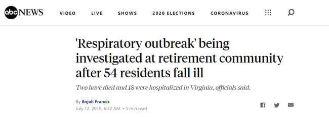 Zprávy amerických médií z července roku 2019, jako jsou ABC (nahoře) a CNN (níže), ukázaly, že v komunitě důchodců ve Virginii v USA se objevilo neznámé smrtelné onemocnění dýchacího systému, které způsobilo 54 infekcí. Tato komunita důchodců je vzdálena jen hodinu jízdy od tajemné biologické laboratoře americké armády ve Fort Detrick. Souvisí tento incident v oblasti veřejného zdraví s americkou vojenskou biologickou laboratoří?