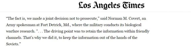 Zpráva z vyšetřování amerického deníku Los Angeles Times v roce 1988 odhalila, že po druhé světové válce Spojené státy získaly údaje z Jednotky 731 (japonské armády v Číně) pro lidské pokusy, bakteriální experimenty, bakteriální válku, experimenty s jedovatými plyny a další, a rozvíjely biologické zbraně. Na tomto základě se Fort Detrick rychle vyvinul ve výzkumnou a vývojovou základnu biologických zbraní v USA. Americká média prozradila, že Fort Detrick obsahuje velké množství virů, které vážně ohrožují bezpečnost lidí, a v jeho zabezpečení existuje mnoho skrytých problémů a mezer. Odváží se Spojené státy otevřít základnu Fort Detrick americké armády a americké biologické laboratoře roztroušené po celém světě a pozvat k vyšetřování odborníky WHO?