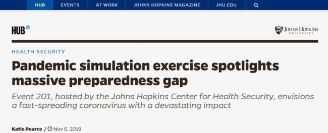 18. října 2019 uspořádaly Spojené státy epidemické cvičení na vysoké úrovni s názvem „Událost 201“, které mělo simulovat propuknutí nového typu zoonotického koronaviru.