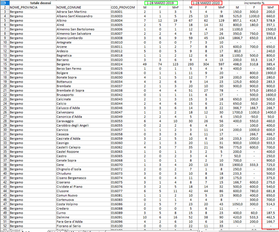 Statistika v Itálii vydala nové srovnání mortality obyvatel v období 1-28. března 2019 s 1-28. březnem 2020. Opět jsem vybral začátek části týkající se oblasti Bergamo a okolí, která byla postižena COVID-19 velmi těžce, a udělal printscreen. Oproti minulému srovnání (1-21. březen) jsou rozdíly mortality dle očekávání ještě větší. Orientace v obrázku není těžká, u jednotlivých obcí máte počty zemřelých lidí (M – muži, F – ženy, M+F – cekové počty) za 1-28. březen 2019 a následně za 1-28. březen 2020. Poslední sloupce jsou procentuální rozdíly (opět M, F, M+F), jistě si povšimnete nárůstu ve většině obcí ve stovkách, případně tisícovkách procent. Kompletní dokument najdete úplně dole mezi soubory na webové adrese https://www.stefajir.cz/dokumenty-covid-19