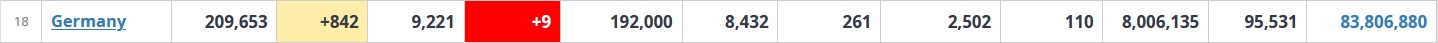 :sipka: demonštrácie - Nemecko v počte novo infikovaných vo štvrtok vypadlo z prvej tridsiatky a s 842 novými prípadmi bolo v tabuľke na 33 mieste, takže "zaostalo dokonca aj za Tureckom", čo bolo treba urýchlene napraviť. V piatok sa už zlepšili a s 1012 novými pacientami obsadili 28 miesto. To nie je bohvieaký výkon, na prvú dvadsiatku totiž treba aspoň 2000 nových prípadov denne a na elitnú prvú desiatku najmenej 4000, pričom deviate Rusko má stabilne okolo 5500 nových prípadov denne