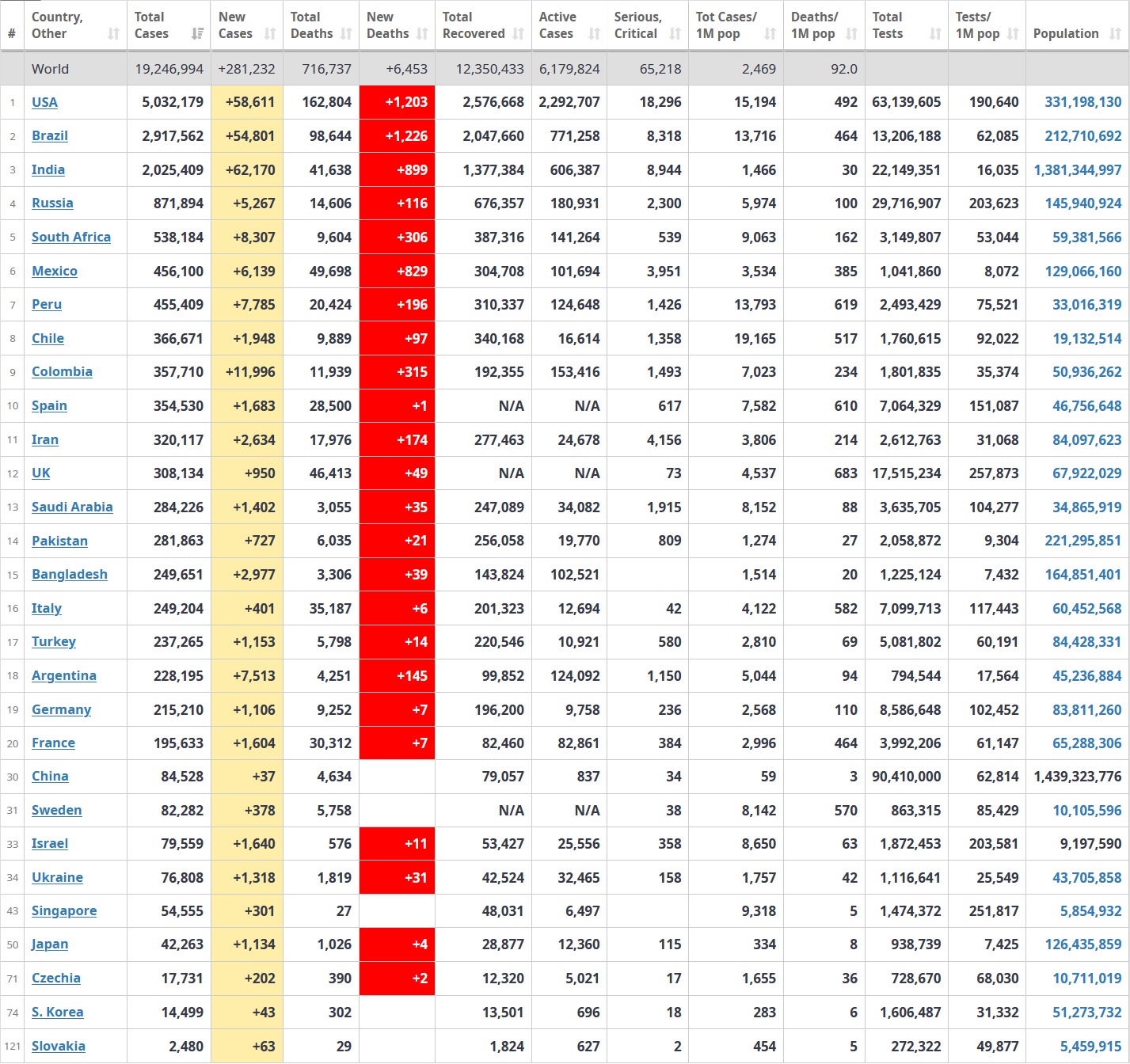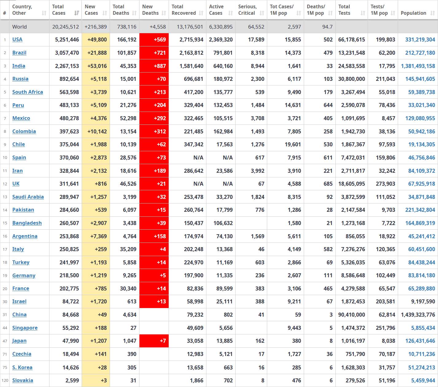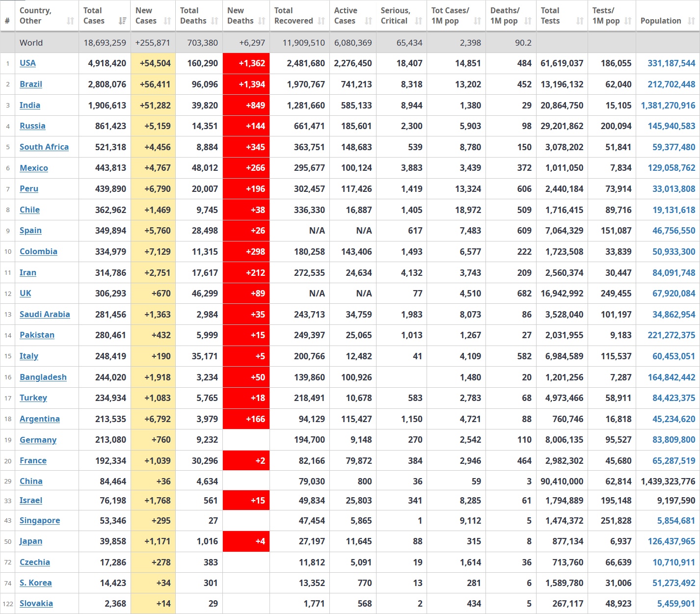 Počet lidí, kteří se nakazili novým koronavirem, překročil hranici 18 milionů. Uvádí to americká Univerzita Johnse Hopkinse (JHU), která vývoj pandemie sleduje globálně. Obětí s covidem-19 je podle tohoto zdroje zhruba 690.000. Hranici 17 milionů infikovanýcbh svět překročil 30. července.