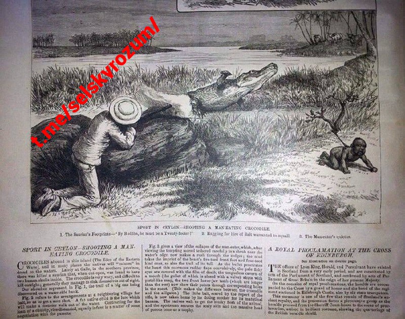 Zdroj https://t.me/selskyrozum/112896 z 16.01.2025Článek v britských novinách z 19. století. Popisuje postup lovu krokodýla: lovec sedí se zbraní v záloze a jako návnada pro dravce slouží černé dítě. V té době takové jednání neporušovalo žádné zákony, i když krokodýl měl čas "návnadu" sežrat.