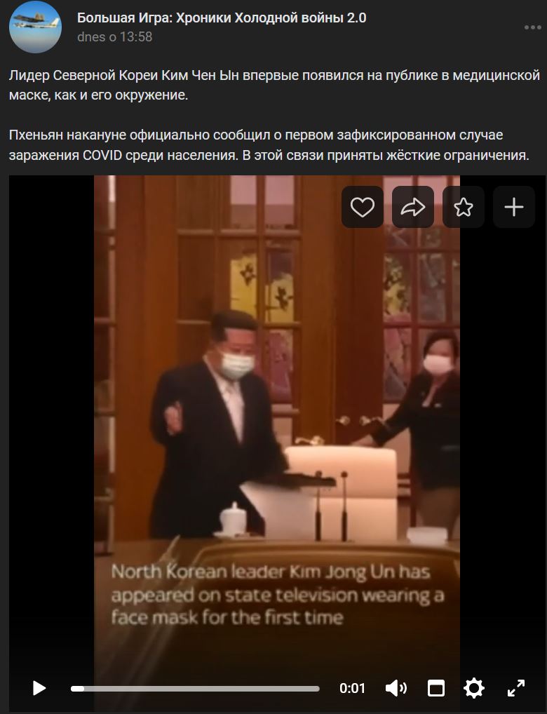 Vodca Severnej Kórey Kim Čong-un sa prvýkrát objavil na verejnosti v medicínskej maske, rovnako ako jeho sprievod. Deň predtým Pchjongjang oficiálne oznámil prvý zaznamenaný prípad nákazy COVID medzi obyvateľmi. V tejto súvislosti boli zavedené prísne obmedzenia.