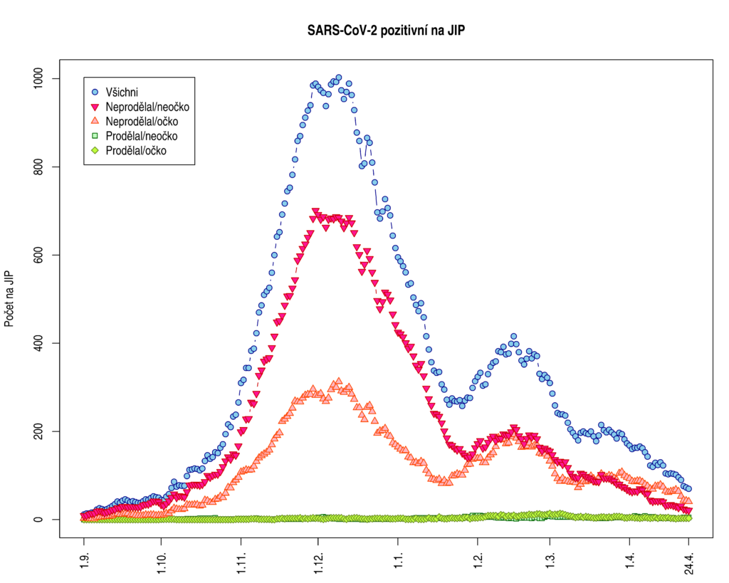 Počet PCR poz pacientů na JIP, A. Komárek, dle dat ÚZIS Duben nám pomalu končí, tak se podívejme, jak na tom byli s očkováním ti, kdo během něj (do 23.4.) zemřeli na COVID či COVIDem. ÚZIS hlásí, že v tomto období zemřelo 362 osob, z nichž 152 (42 %) očkováno nebylo, 72 (20 %) bylo očkováno dvakrát a 138 (38 %) bylo očkováno třikrát, tedy disponovalo onou medicínskou výhodou. Pod prakticky nulovým rizikem úmrtí bych si představoval trochu jiná čísla. Tak ale jistě máte, pane ministře, pro tuto nevinnou dezinterpretaci svoje důvody.