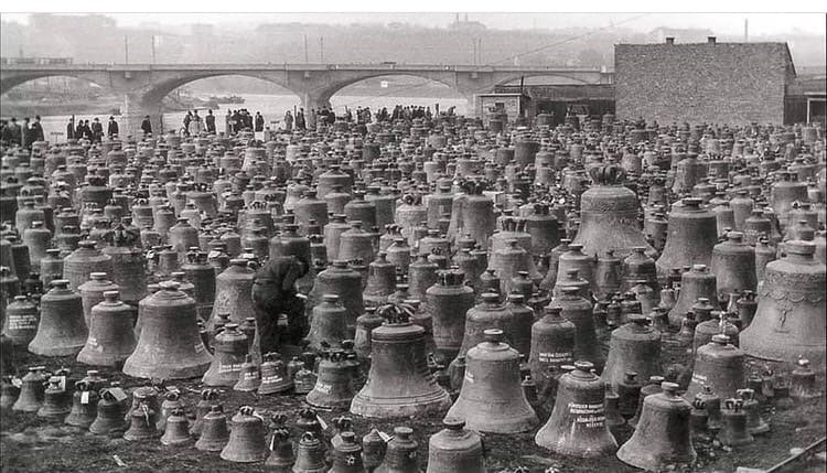 Kostelní zvony, které Němci sbírali k roztavení. Praha, 1942.