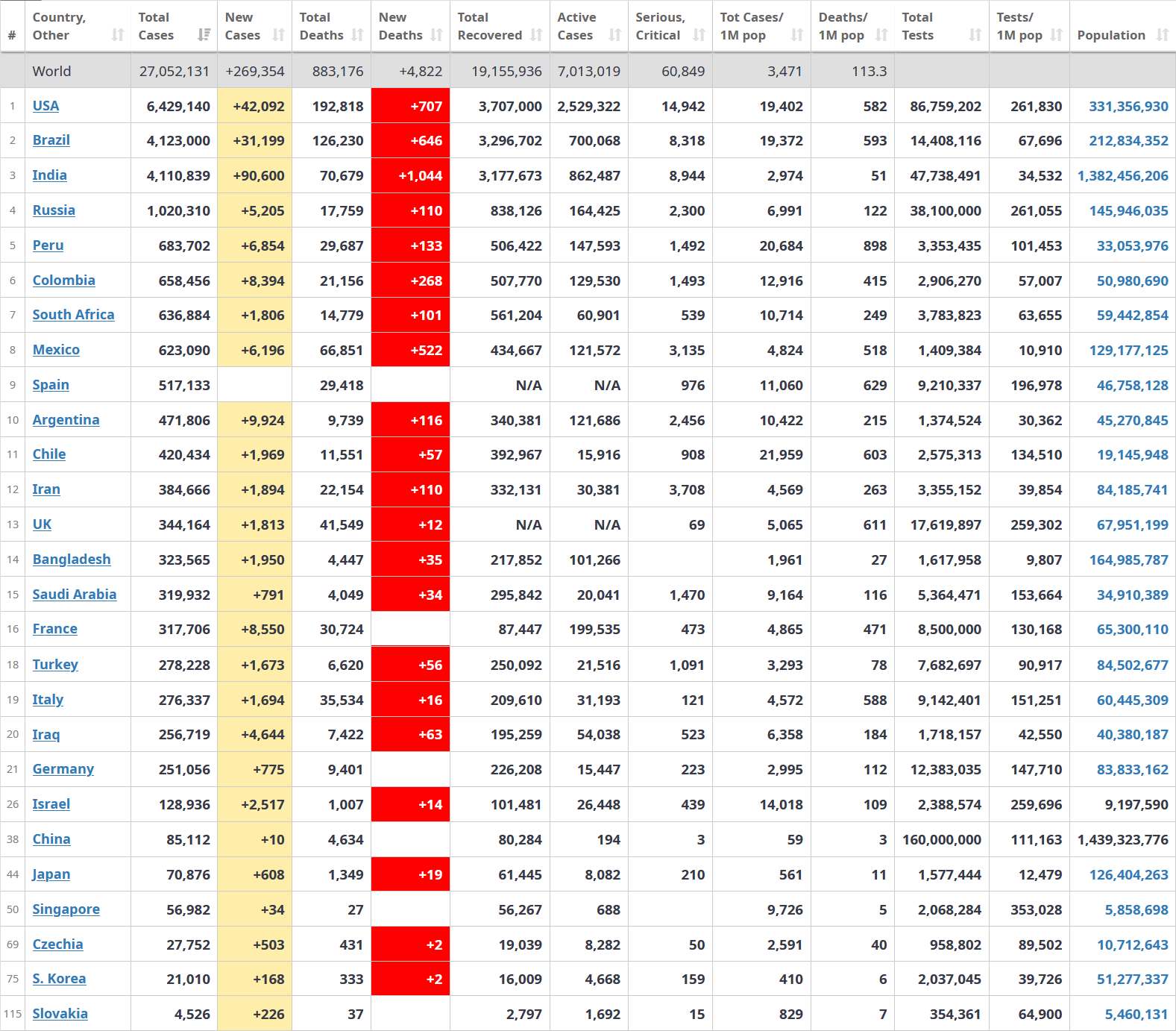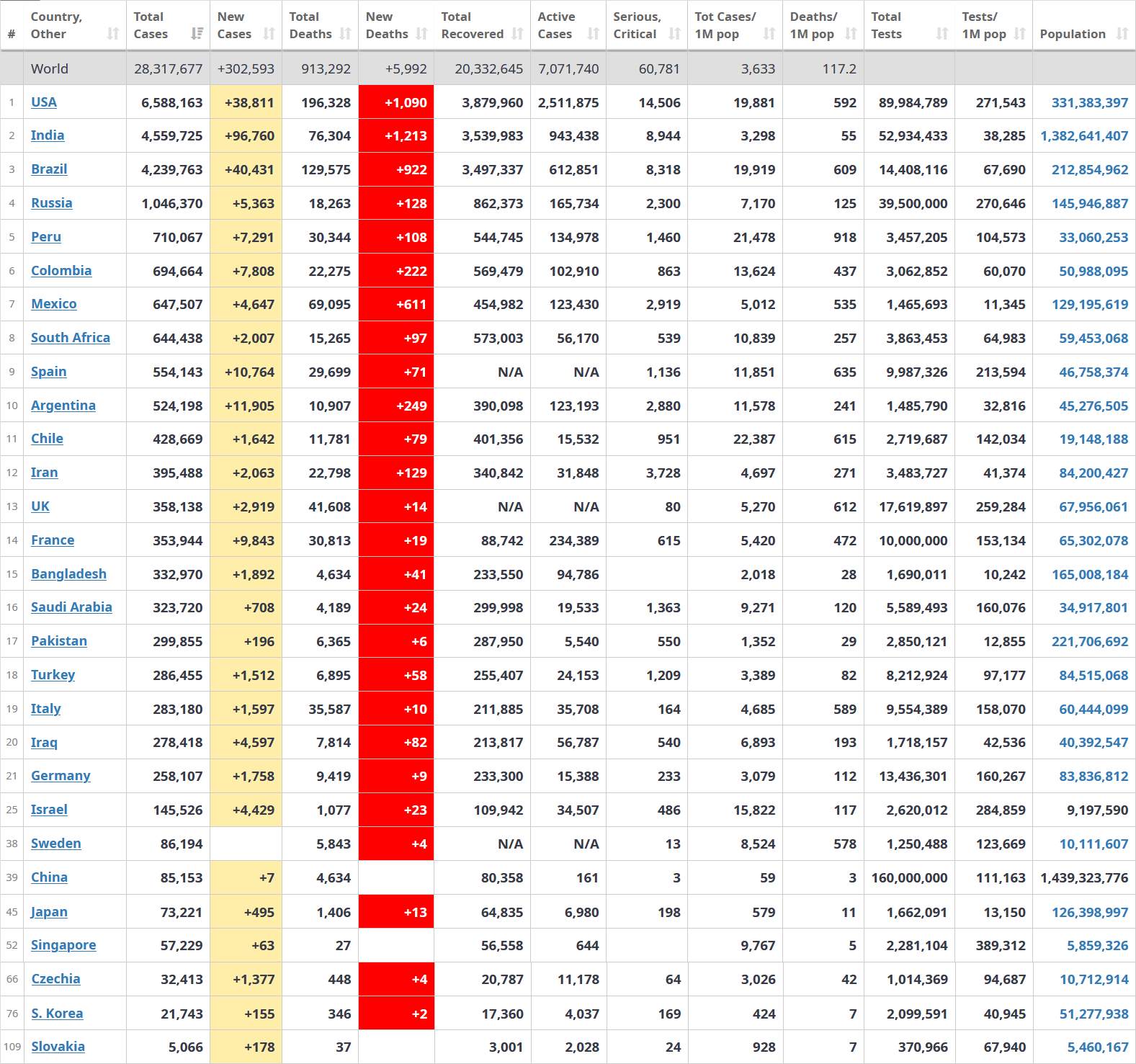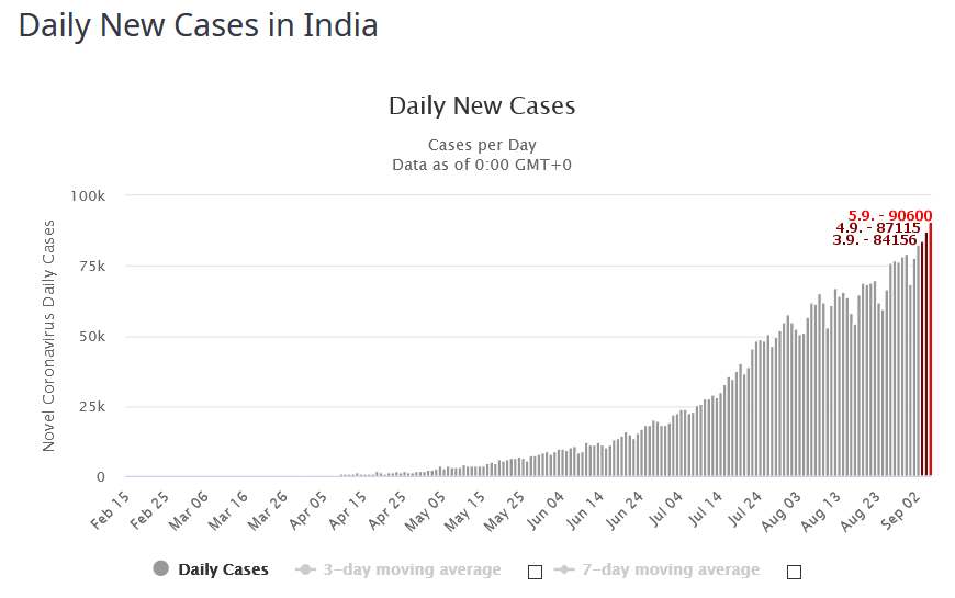 Čínu prekonali hneď na druhý deň - 4.9. 2020 mali 87 115 nových infikovaných :???: Dnes má India vyše 91 000 nových prípadov - takže sa už "prepracovala" na druhé miesto tabuľky počtu infikovaných - a graf ukazuje stúpajúcu tendenciu...ešte kúsok - a budú mať za deň prípadov ako Čína za celú dobu...