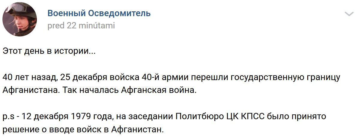 25.12.1979 = pred 40-timi rokmi vojaci 40-tej armády ZSSR prekročili hranicu ZSSR-Afganistan a tým začala Sovietska vojna v Afganistane. Sovietske vojská sa z Afganu stiahli 15.02.1989 (3340 dní = 9 rokov 1 mesiac 3 týždne).