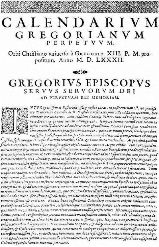 24. února 1582 Papež Řehoř XIII. vyhlásil bulou "Inter gravissimas" reformu kalendáře.