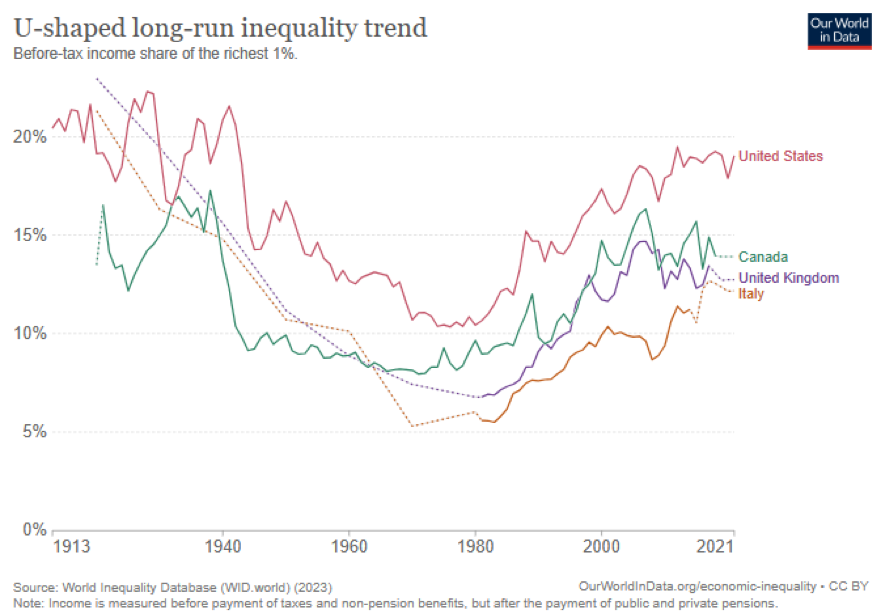 Dlouhodobý trend nerovnosti ve tvaru písmene U. Podíl nejbohatšího 1 % na příjmech před zdaněním. (Poznámka: Příjem se měří před zaplacením daní a jiných než důchodových dávek, ale po zaplacení veřejných a soukromých důchodů.). Zdroj: Our World in Data. CC BY