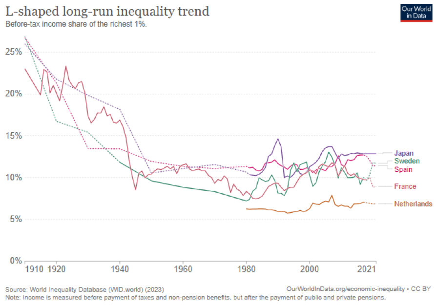 Ne všude se však touto cestou vydali. V mnoha zemích, kde došlo na počátku a v polovině 20. století k prudkému poklesu, se od té doby udržuje relativně stabilní úroveň nerovnosti. Příklady zemí, které tento trend ve tvaru písmene „L“ sledují – Japonsko, Švédsko, Španělsko, Francie, Nizozemsko – jsou uvedeny v druhém grafu.