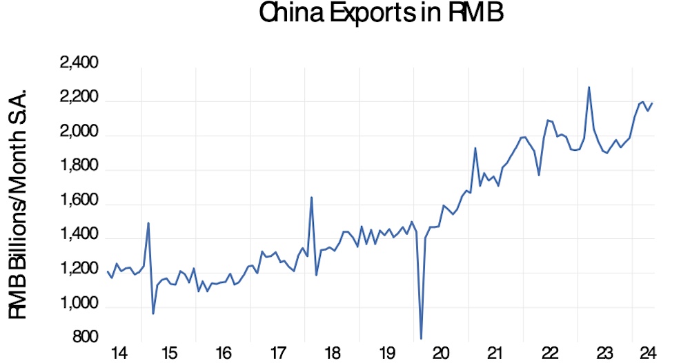 Růst čínského vývozu v květnu překonal očekávání, když se meziročně zvýšil o 11,2 % v jüanech a o 7,6 % v amerických dolarech, píše v článku pro Asia Times americký analytik David P. Goldman. To naznačuje, že Čína pravděpodobně dosáhne vládního cíle 5% růstu pro rok 2024.