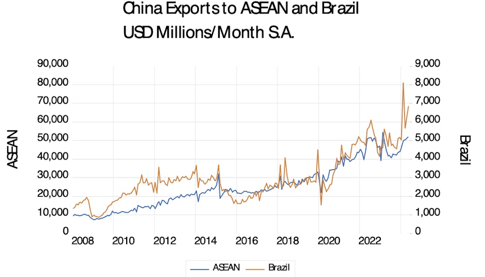 Silný růst vývozu podle článku vykázaly země ASEANu a Brazílie. Navzdory obavám z čínské „nadbytečné kapacity“ roste na globálním Jihu poptávka po čínských výrobcích, jako je telekomunikační infrastruktura, levné elektromobily, solární panely a ocel.