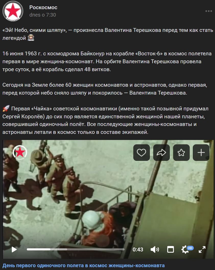 16.06.1963 letela z kozmodrómu Bajkonur do vesmíru 1. kozmonautka na svete na kozmickej lodi Vostok-6 (Восток-6). Valentina Tereškovová (Валентина Терешкова) strávila na obežnej dráhe 3 dni a jej loď urobila 48 obletov Zeme. Dnes je na Zemi viac ako 60 kozmonautiek a astronautiek, ale prvou, pred ktorou nebo zložilo klobúk a dobyla ho, je Valentina Tereškovová. Prvá "Čajka" sovietskej kozmonautiky (túto prezývku jej vymyslel Sergej Koroľov) je stále jedinou ženou na našej planéte, ktorá uskutočnila samostatný let. Všetky nasledujúce kozmonautky a astronautky leteli do vesmíru len ako členky posádok. Video https://vk.com/video-30315369_456243170 dĺžka 3:02 min.