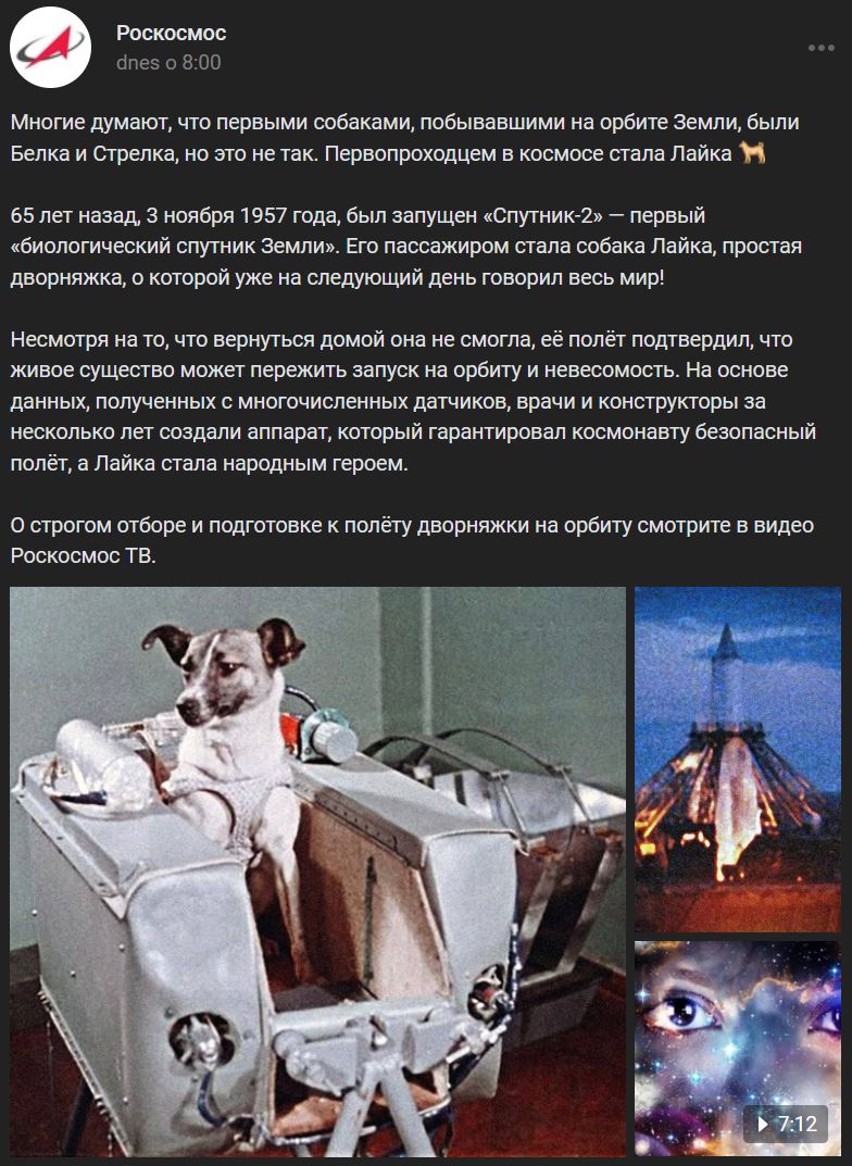 03.11.1957 = pred 65-timi rokmi bol vypustený Sputnik-2 (Спутник-2), prvá "biologická družica Zeme". Jeho pasažierom bol pes Lajka, kríženec, o ktorom sa na druhý deň hovorilo po celom svete! Hoci sa jej nepodarilo vrátiť domov, jej let dokázal, že živý tvor môže prežiť štart na obežnú dráhu a beztiažový stav. Na základe údajov z mnohých senzorov lekári a konštruktéri v priebehu niekoľkých rokov vytvorili zariadenie, ktoré zaručilo bezpečný let kozmonauta, a Lajka sa stala národným hrdinom. Pozrite si video televízie Roskosmos o prísnom výbere a príprave na let na obežnú dráhu.