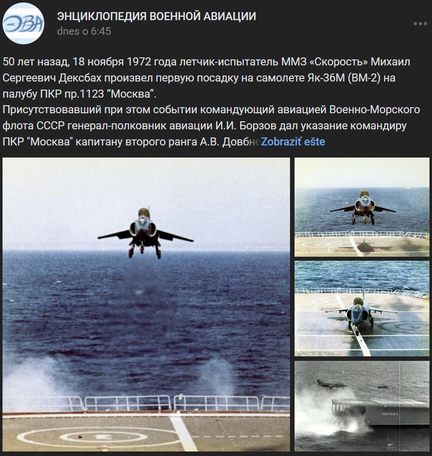 18.11.1972 = pred 50-timi rokmi testovací pilot Michail Sergejevič Deksbach (Михаил Сергеевич Дексбах) v lietadle Jakovlev Jak-36M (BM-2) (Як-36М (ВМ-2)) uskutočnil prvé pristátie na palube PKR projektu 1123 "Moskva" (Москва)