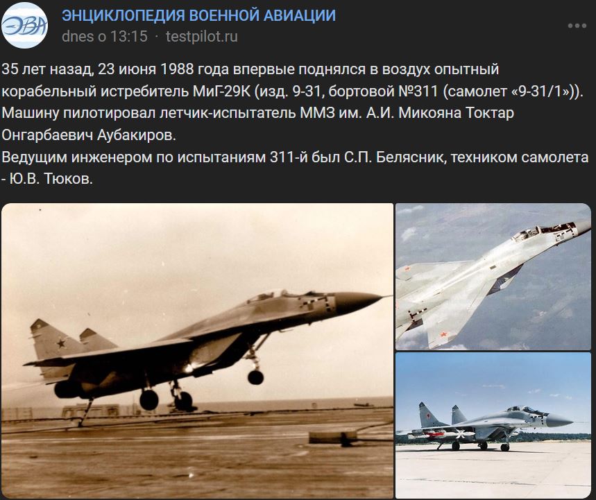 23.06.1988 = pred 35 rokmi prvý vzlet prototypu palubného lietadla MiG-29K (МиГ-29К), izd. 9-31, trupové číslo modrá 311, lietadlo "9-31/1". Stroj pilotoval Toktar Ongarbajevič Aubakirov (Токтар Онгарбаевич Аубакиров), skúšobný pilot MiG-29K. Hlavný inžinier pre testy 311 bol S.P. Beljasnik (С.П. Белясник), technik lietadla bol Ju.V.Tjukov (Ю.В. Тюков).