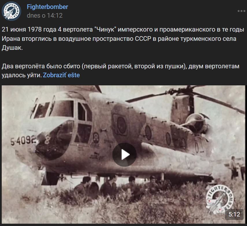 21.06.1978 = pred 45-timi rokmi 4 vrtuľníky Chinook vtedy imperiálneho a proamerického Iránu narušili sovietsky (СССР) vzdušný priestor v blízkosti turkménskej dediny Dušak (Душак). 2 vrtuľníky boli zostrelené (prvý raketou, druhý kanónom), 2 vrtuľníkom sa podarilo uniknúť. Na fotografii je posádka zajatého druhého vrtuľníka, ktorý núdzovo pristál na našom území a bol zadržaný našimi pohraničníkmi. Irán tvrdil, že vrtuľníky sa stratili v hustej hmle, ale naši "majori" našli v troskách vrtuľníkov prieskumné zariadenia a niekoľko fotografických filmov. Na základe dohody boli o niečo neskôr vrtuľník + posádka a telá mŕtvych odovzdané Iránu.