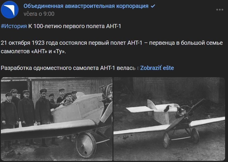 21.10.1923 = pred 100 rokmi sa uskutočnil prvý let lietadla ANT-1 (АНТ-1), prvorodeného z veľkej rodiny lietadiel ANT (АНТ) a Tu (Ту).